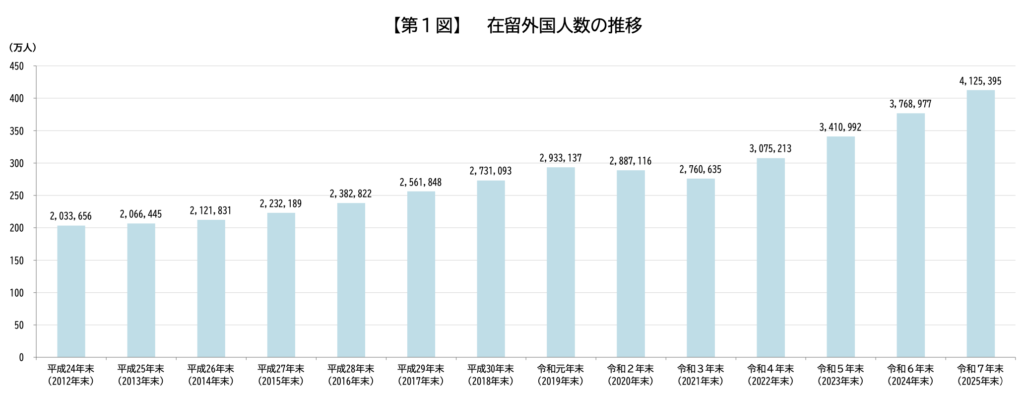 令和7年末の在留外国人数は、412万5,395人(前年末比35万6,418人、9.5%増)で、過去最高を更新するとともに初めて400万人を超えた。出入国在留管理庁